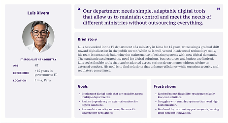 User personas: We identified key user personas to represent the primary profiles interacting with Facilita Perú. This helped us understand the varying needs and challenges across different government scales.